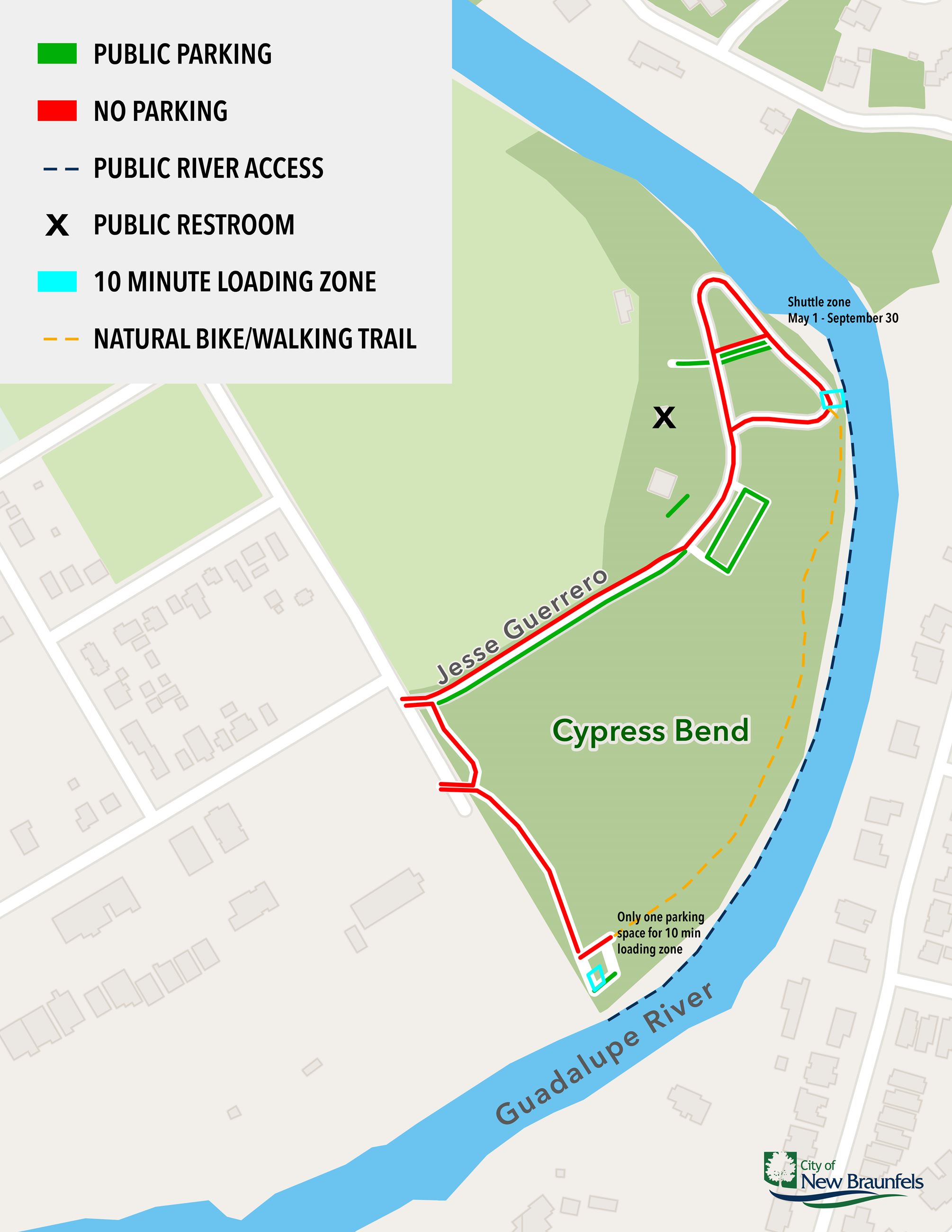 Public parking is available in Cypress Bend Park. Parking fees are $20 per vehicle unless you are a resident of New Braunfels and have applied for a Resident River Parking Permit.