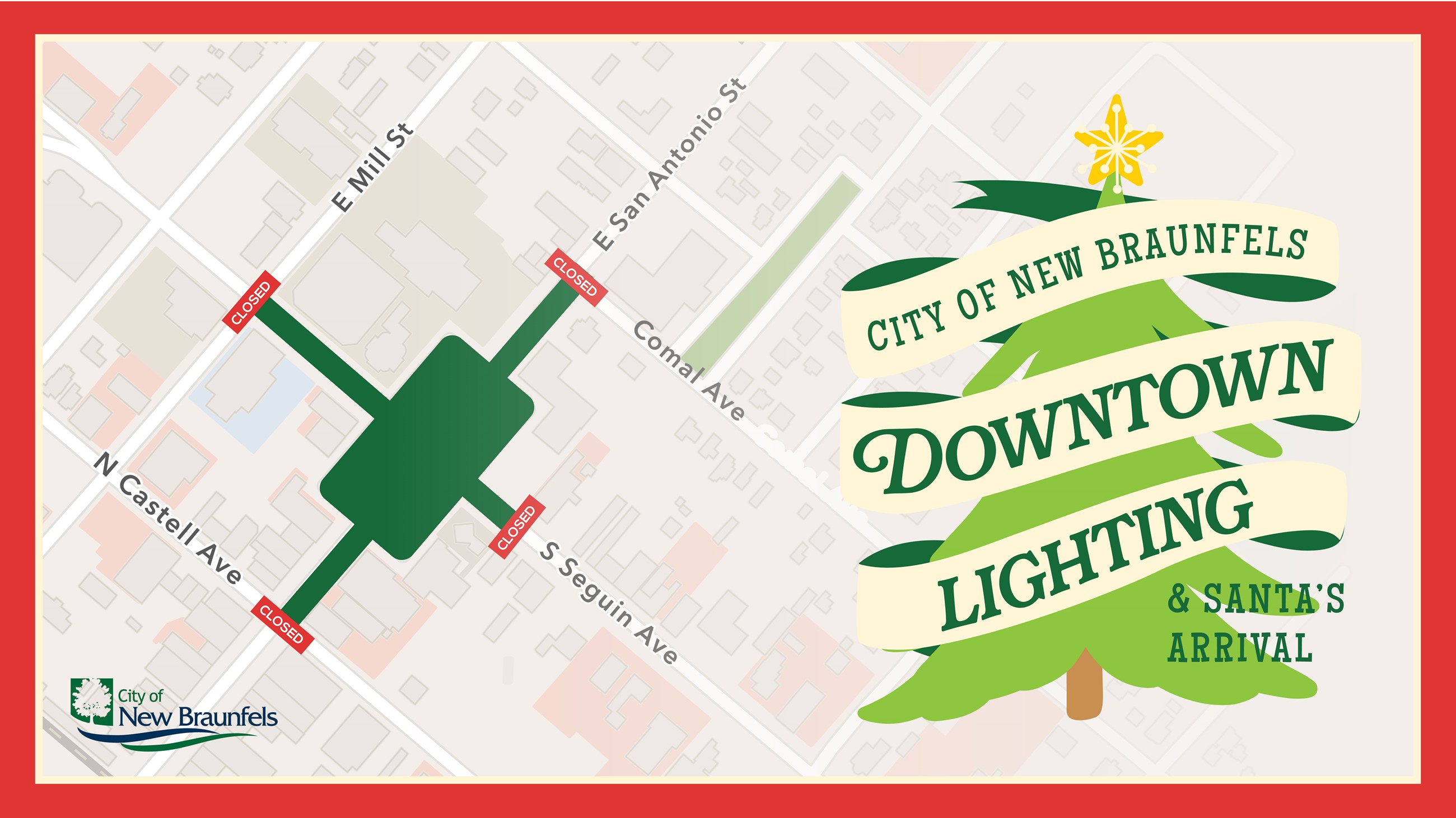 Downtown Lighting and Santa's Arrival will be happening in Downtown New Braunfels on November 22. Road closures will begin at 4:30 p.m. and reopen by 9:30 p.m. Click the map below to see a larger view of the event map.