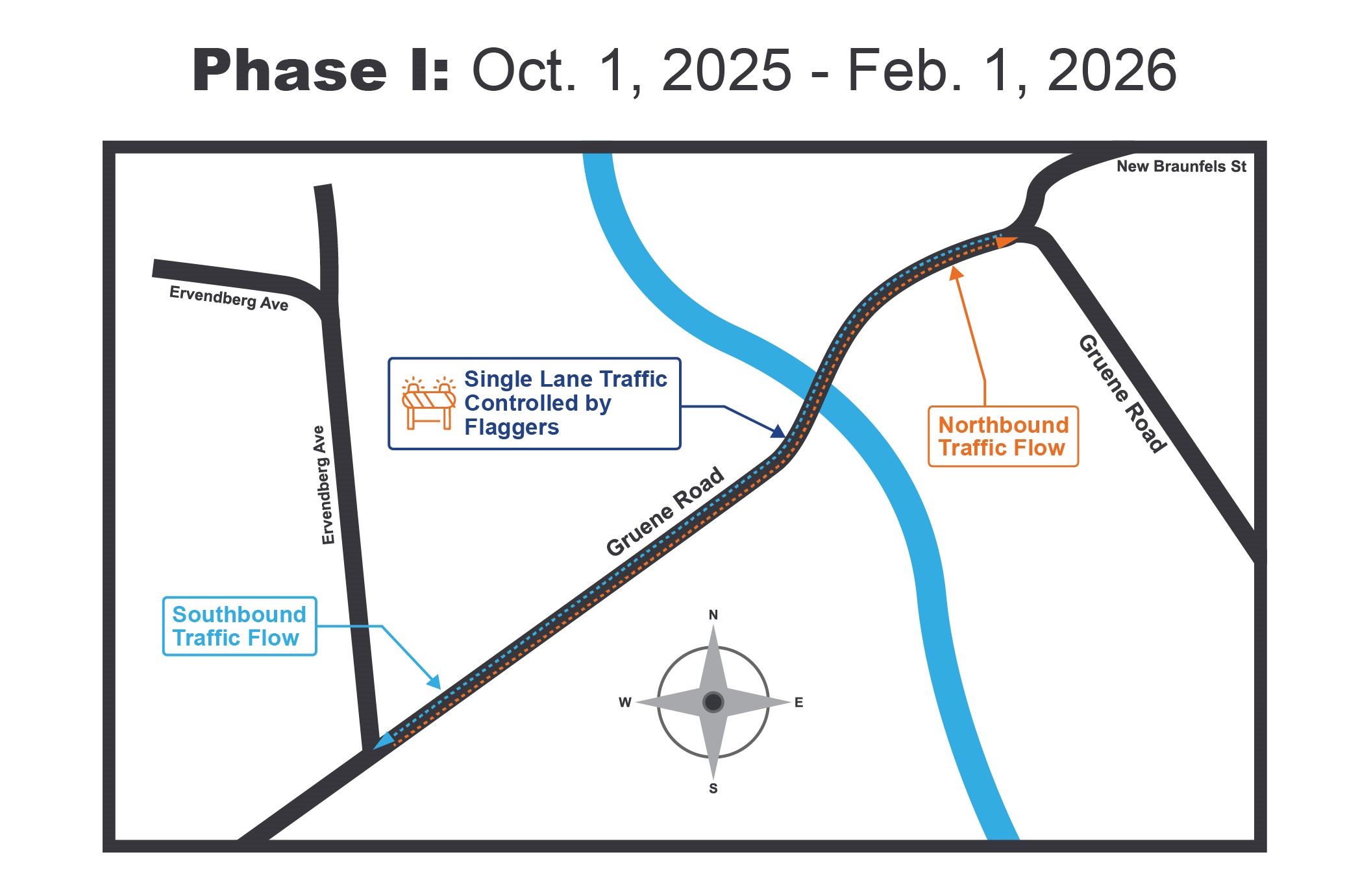 Gruene Road from the top of the hill on Gruene Road to Ervendberg Avenue will be under construction starting Wednesday, October 1. This New Braunfels Utilities (NBU) project will take place at night only, Sunday nights through Friday mornings, from 11 p.m. to 7 a.m. During those times, traffic will be reduced to one lane with flaggers directing drivers.