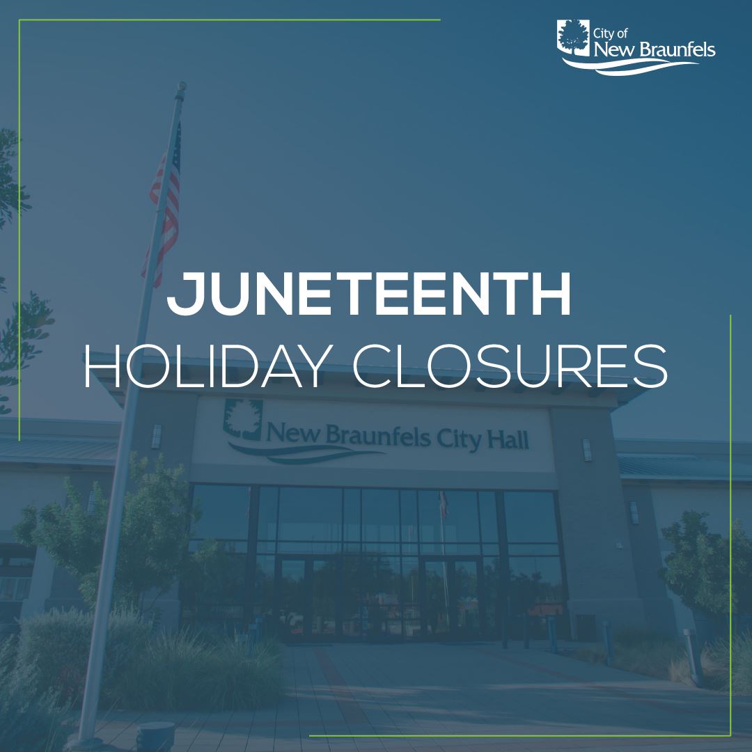 Many City of New Braunfels facilities will be closed on Monday, June 20, 2022, in observance of the Juneteenth holiday. This includes: