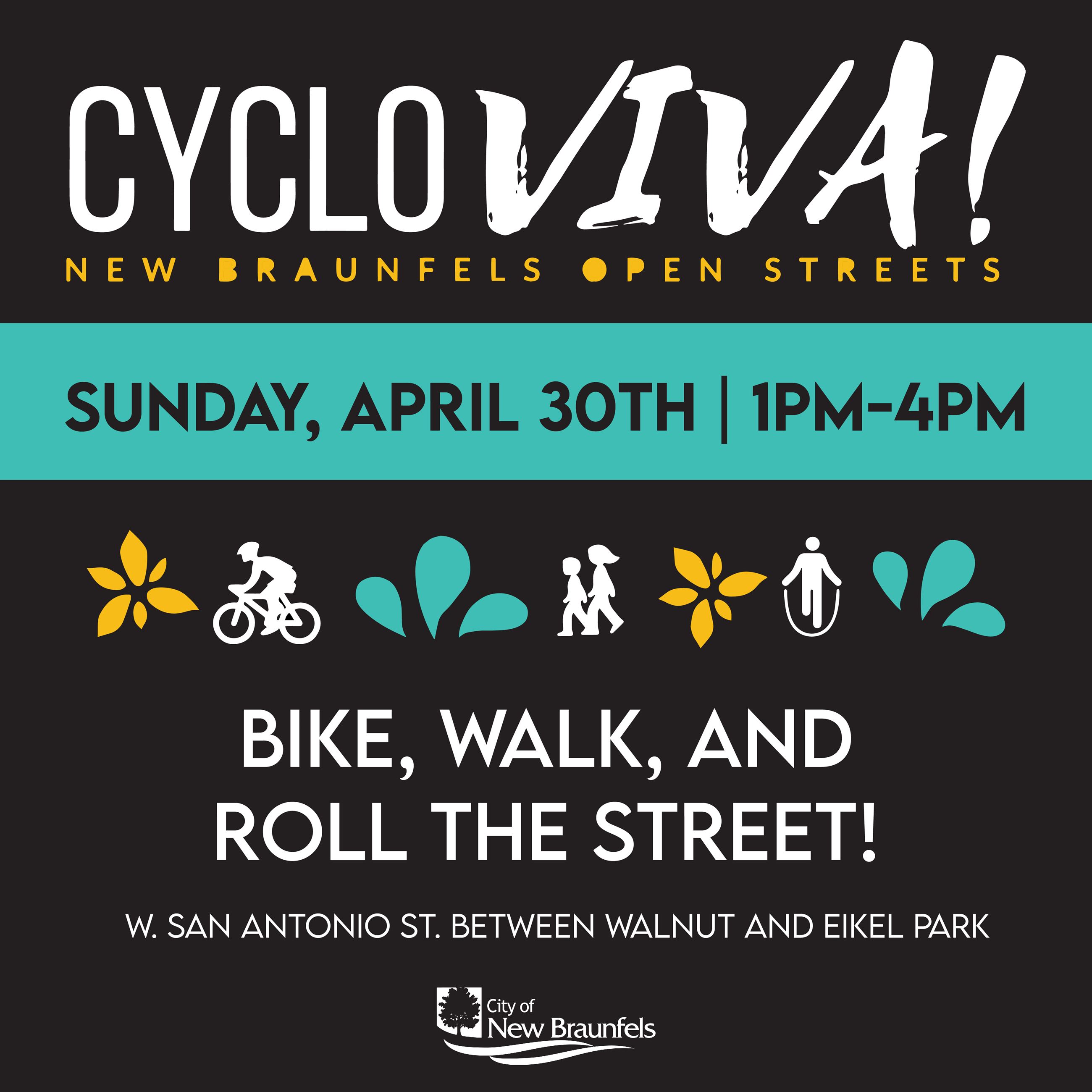 The CycloViva! event in New Braunfels is modeled after the “ciclovía” program in Bogotá, Colombia, where for 45 years, local citizens enjoy a weekly break from cars in their streets so they can exercise, bicycle, skate, walk, and play safely. Again, this year’s free CycloViva! event in New Braunfels is set for Sunday, April 30th, 2023, from 1pm to 4pm on West San Antonio Street between Walnut Avenue and Grape Avenue.
