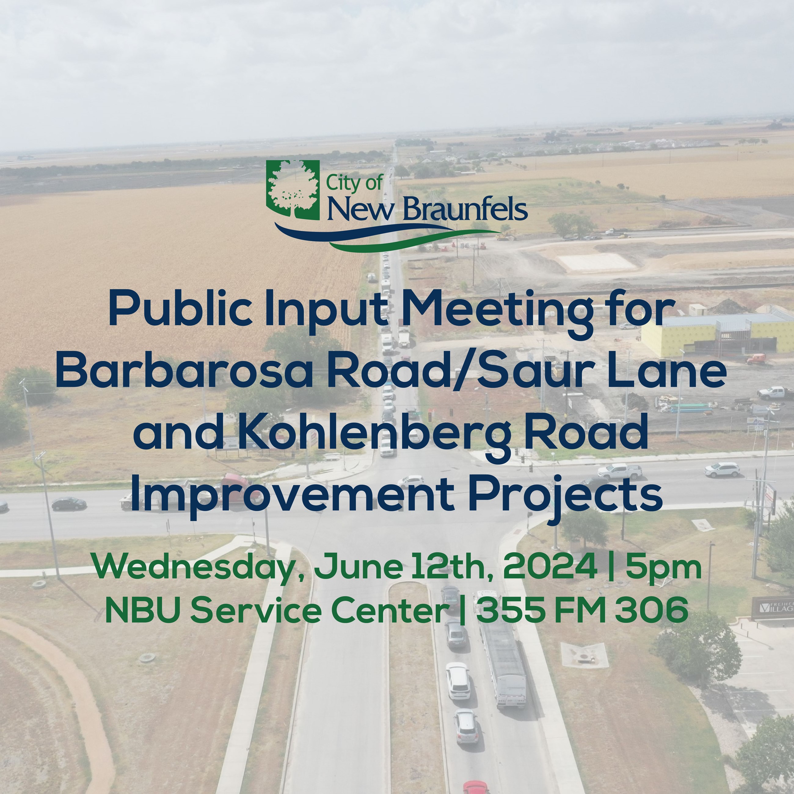 The Open House public meeting for the Barbarosa Road/Saur Lane Improvement project (from FM 1101 to Saengerhalle Road) and the Kohlenberg Road Improvement Project (FM 1101 to IH-35) will be held on Wednesday June 12th, 2024, from 5:00pm to 6:30pm at the NBU Service Center, located at 355 FM 306.