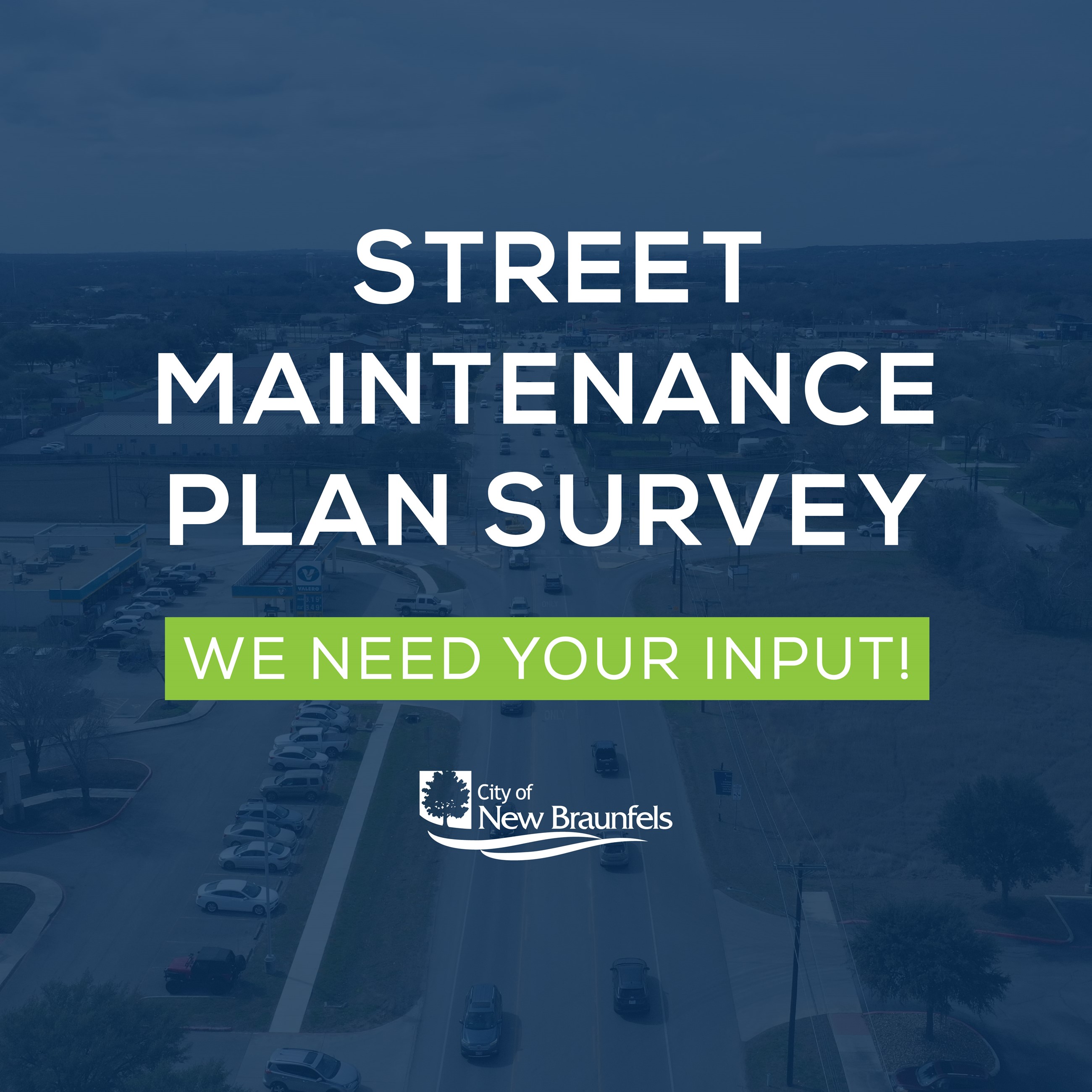 For those that are unable to attend the public forum, an online survey will be available through August 9th, giving residents a chance to submit their input on the Street Maintenance Plan online. To fill out the survey, visit www.newbraunfels.gov/streetsurvey.