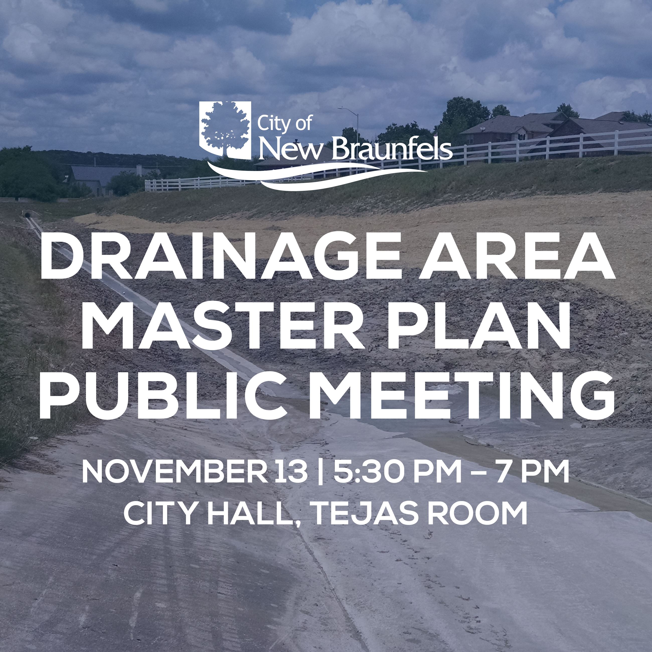 The public meeting will be held from 5:30pm to 7pm on Wednesday, November 13th, 2024, at New Braunfels City Hall, located at 550 Landa Street. For those that are unable to attend the meeting, residents will also be able to view the materials and leave their drainage-related input using an online form by visiting www.newbraunfels.gov/damp.