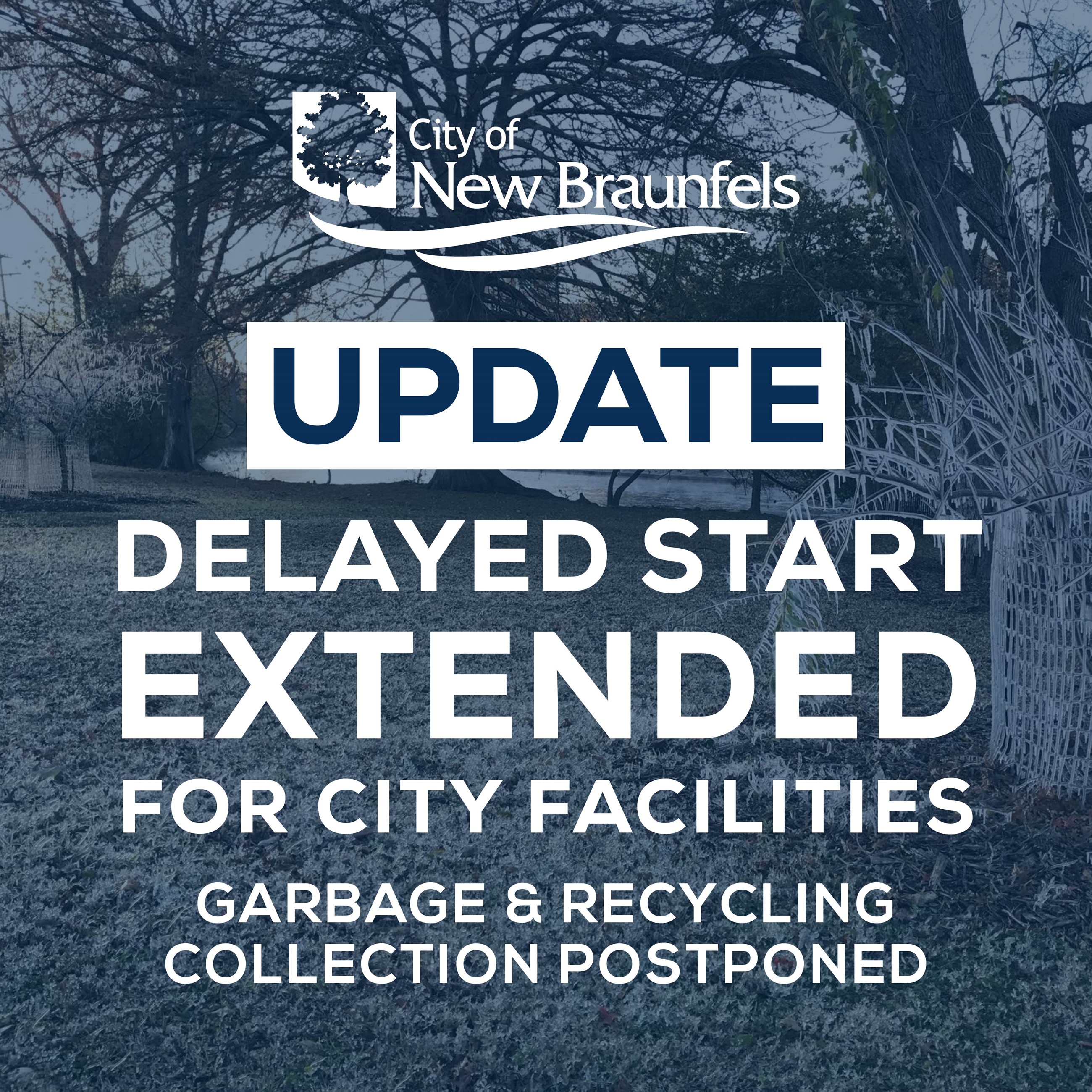 ORIGINAL MEDIA RELEASE: Ice and snow accumulation during the overnight hours has prompted an extension of the delayed opening for City of New Braunfels facilities and the postponement of garbage and recycling collection.