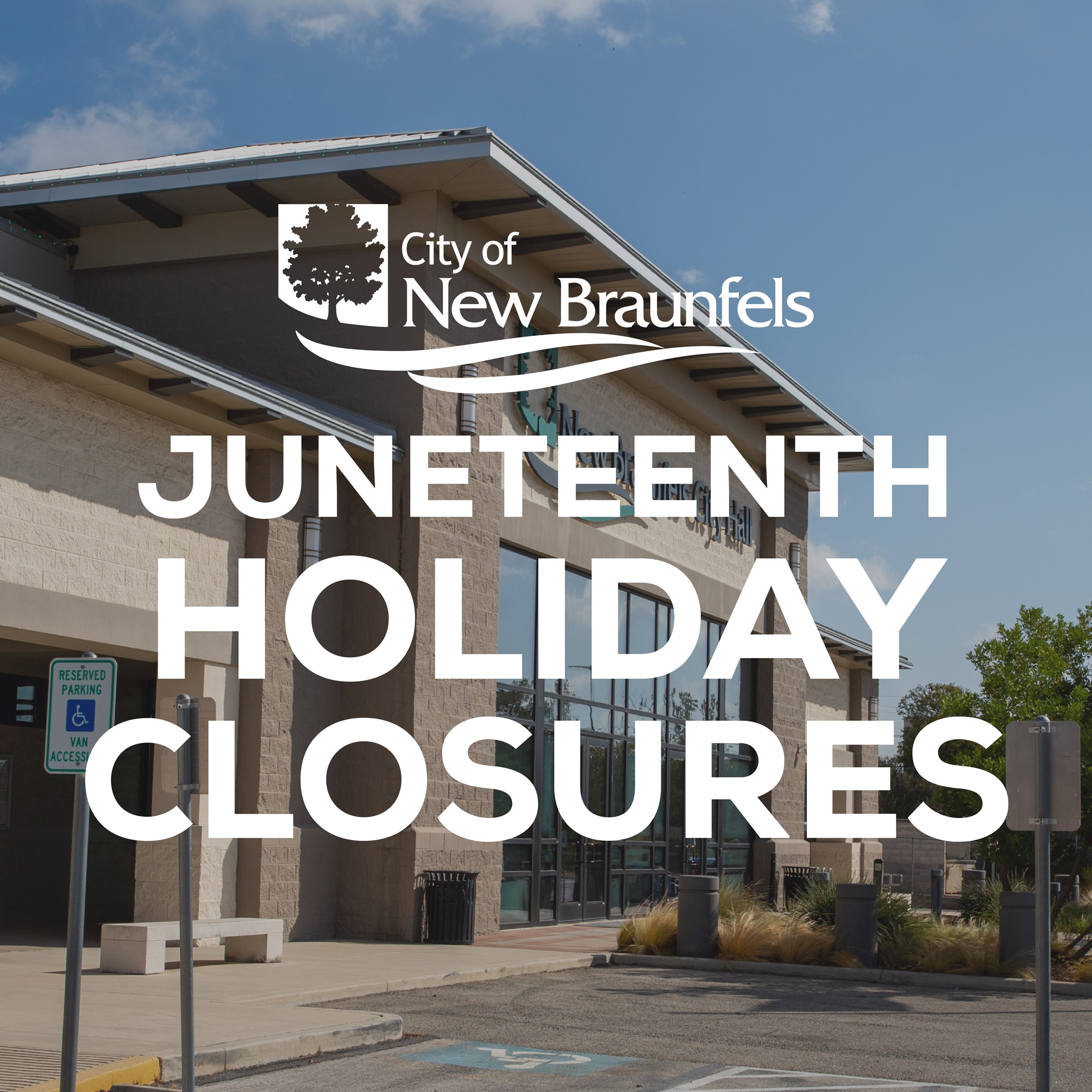 Many City of New Braunfels facilities will be closed on Thursday, June 19th, 2025, in observance of the Juneteenth holiday. This includes: