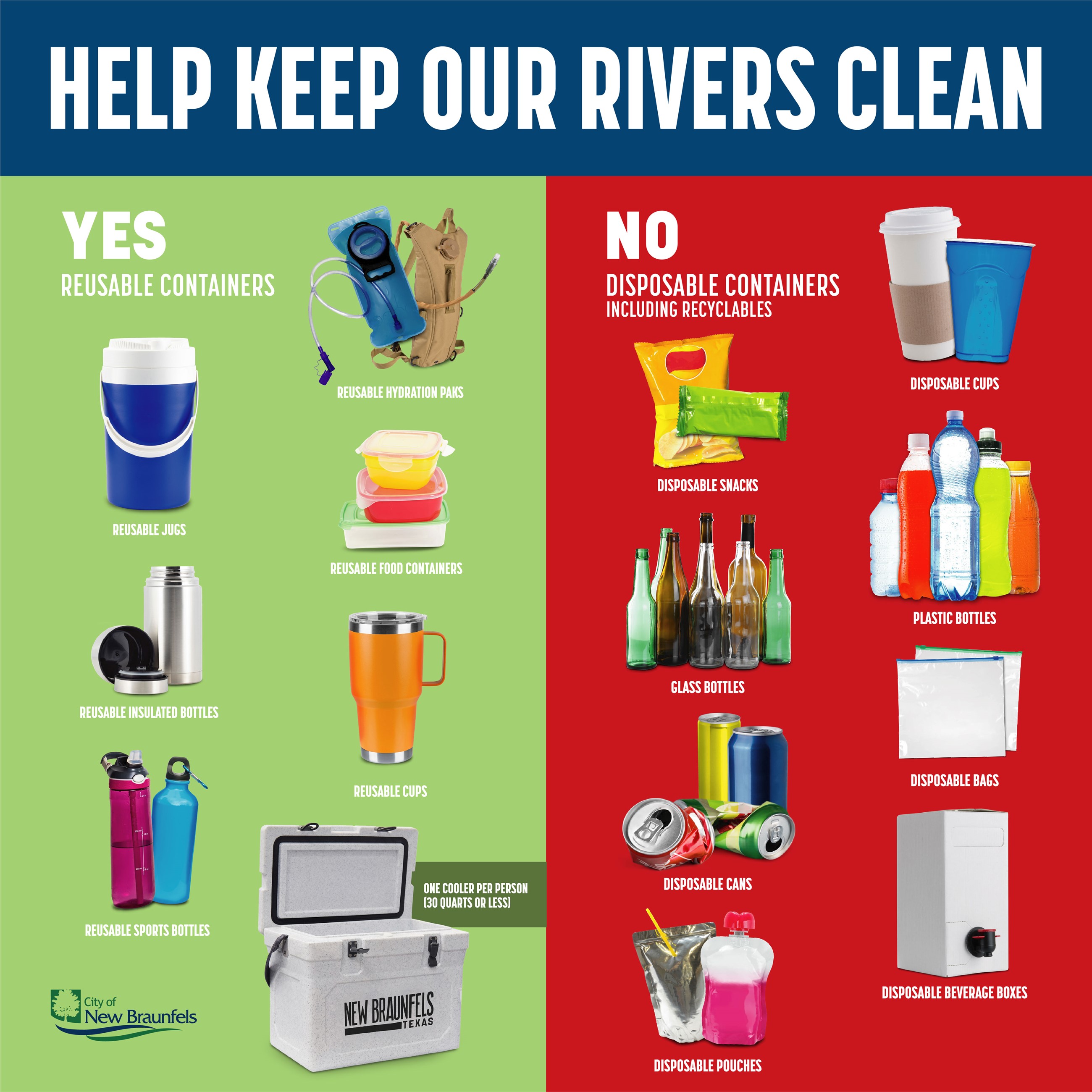 The City of New Braunfels passed an ordinance prohibiting the use of disposable containers on the rivers inside of the city limits. It is the goal of the city to preserve the Comal Springs for the future enjoyment of all. With an annual litter collection of over 30,000 lbs from the rivers, the city knew measures had to be taken to reduce the amount of single use containers polluting the waters each year. Since the implementation of the ban on disposable containers, litter collection has been reduced by 41%