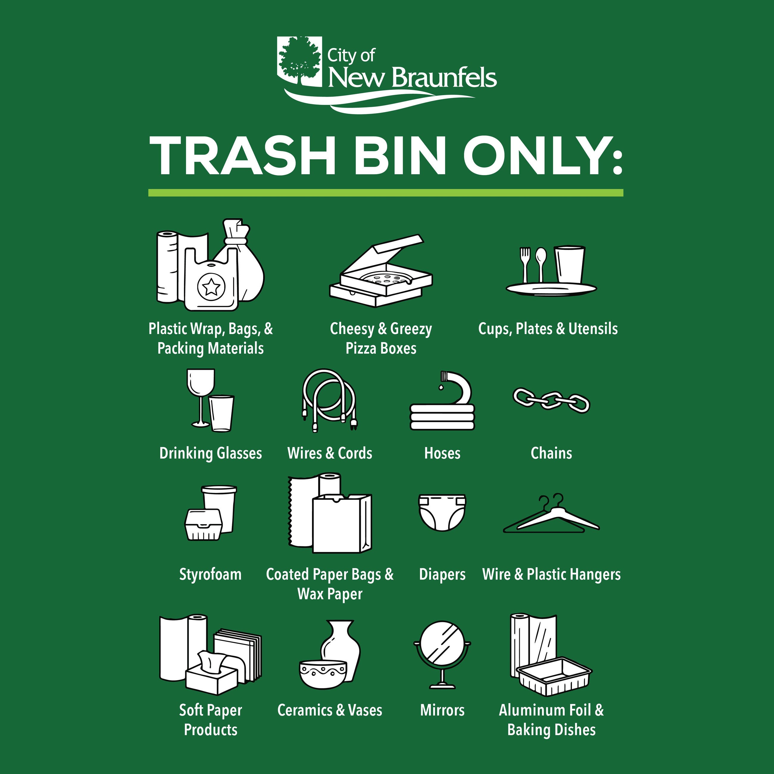 • Become familiar with the accepted items list. Keep all plastic bags, styrofoam, and trash out.