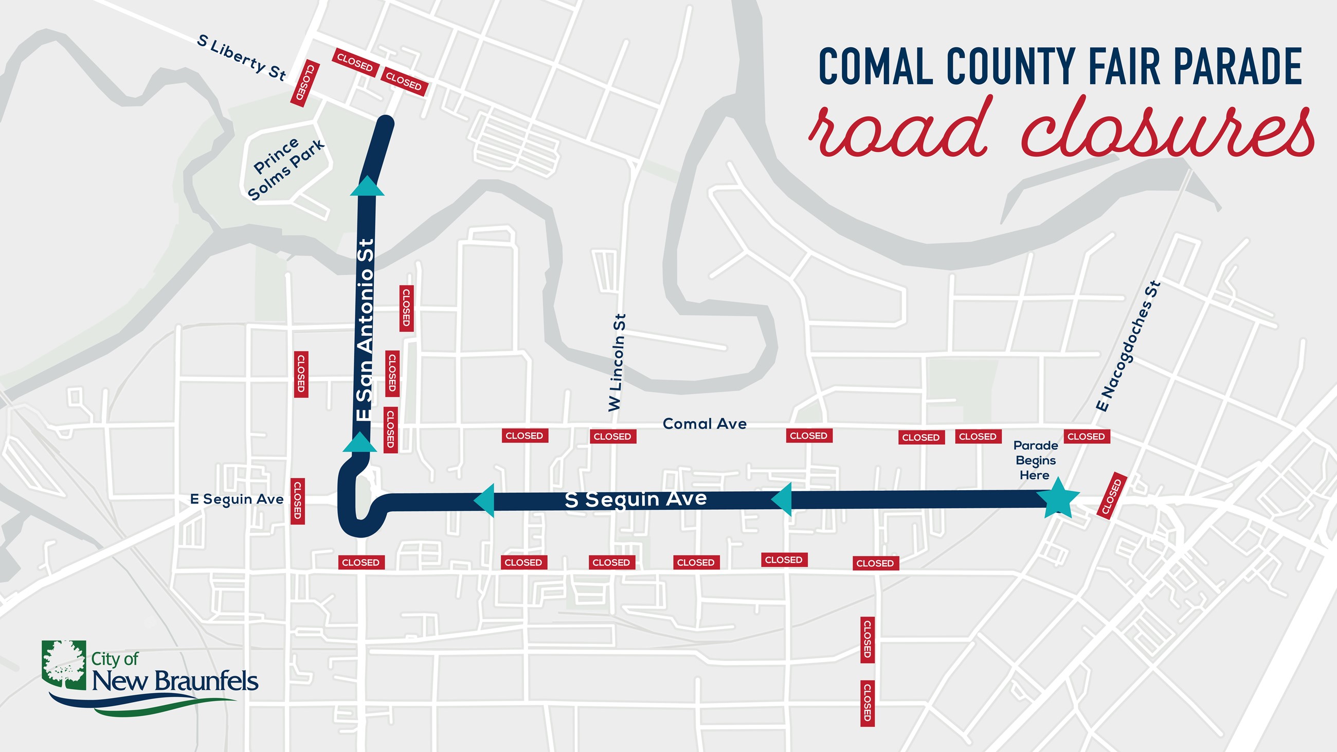 South Seguin Avenue, Main Plaza, East San Antonio Street, and other surrounding streets will be begin at 7 a.m. Street closures will remain in place until approximately 1 p.m.
