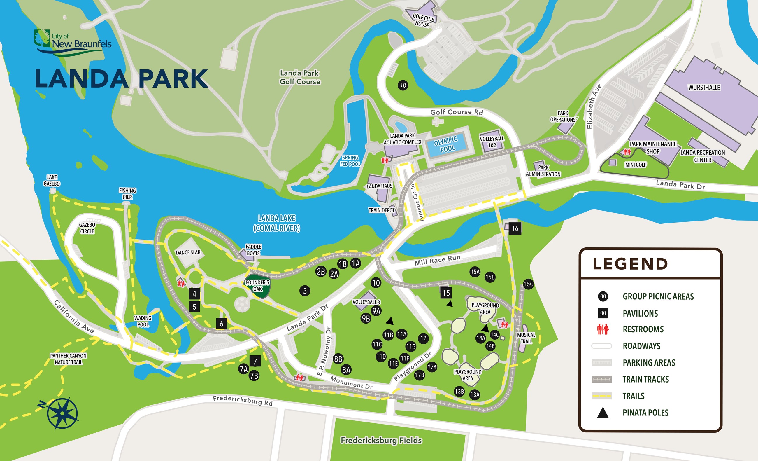 Located in the heart of the Texas Hill Country, the 51-acre Landa Park offers a variety of amenities under the shade of giant oak trees including miles of walking trails, three playgrounds, an outdoor amphitheater (known as the Dance Slab), a miniature train, two hiking trails in Panther Canyon, an arboretum, the Landa Park Aquatic Complex, the Wurstfest grounds, and the world famous Comal Springs and the beginning of the Comal River.