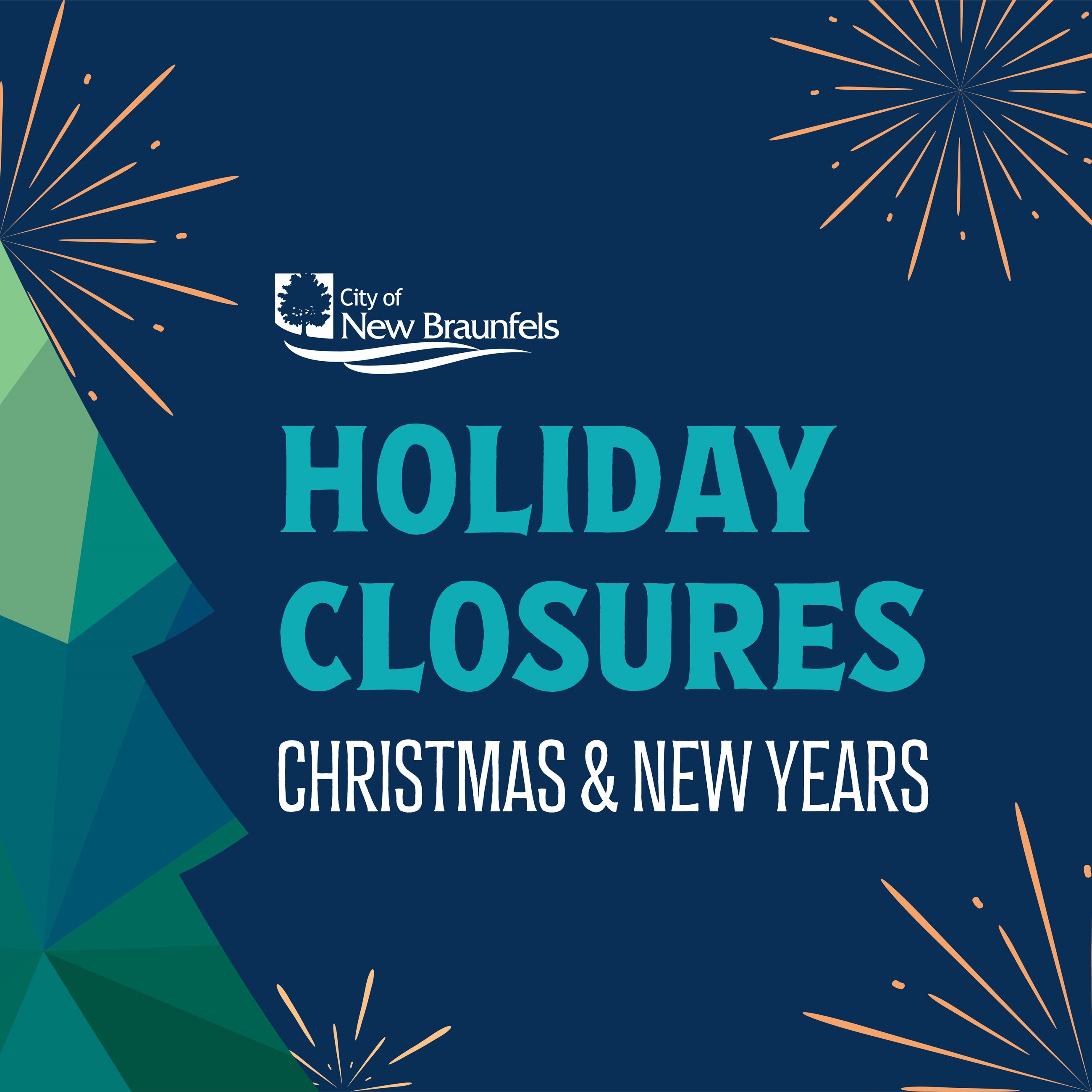 Many City of New Braunfels facilities will be closed on Monday, Dec. 25th, and Tuesday, Dec. 26th, 2023, in observance of the Christmas Eve and Christmas Day holidays. Additionally, those facilities will be closed on Monday, Jan. 1st, 2024, in observance of the New Year’s Day holiday. This includes: