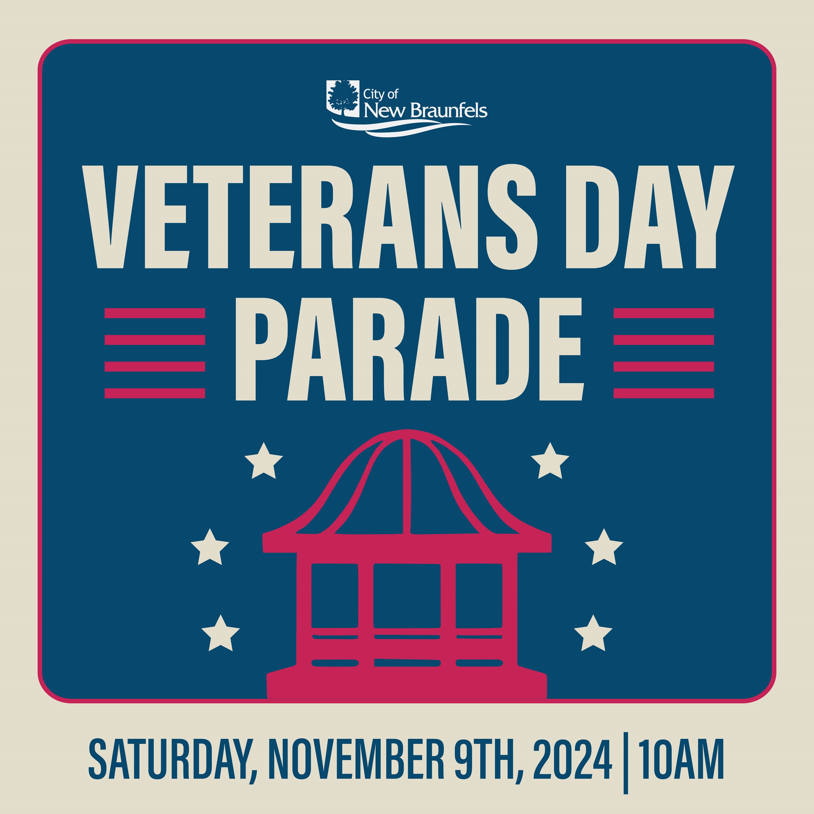 Again, road closures for the annual Veterans Day Parade begin at 7am and the parade begins at 10am on the streets of downtown New Braunfels, with a Veterans Day ceremony in Prince Solms Park beginning at 11am. For more about the Veterans Day Parade and Ceremony, including a map of the parade route, visit www.newbraunfels.gov/veteransday.